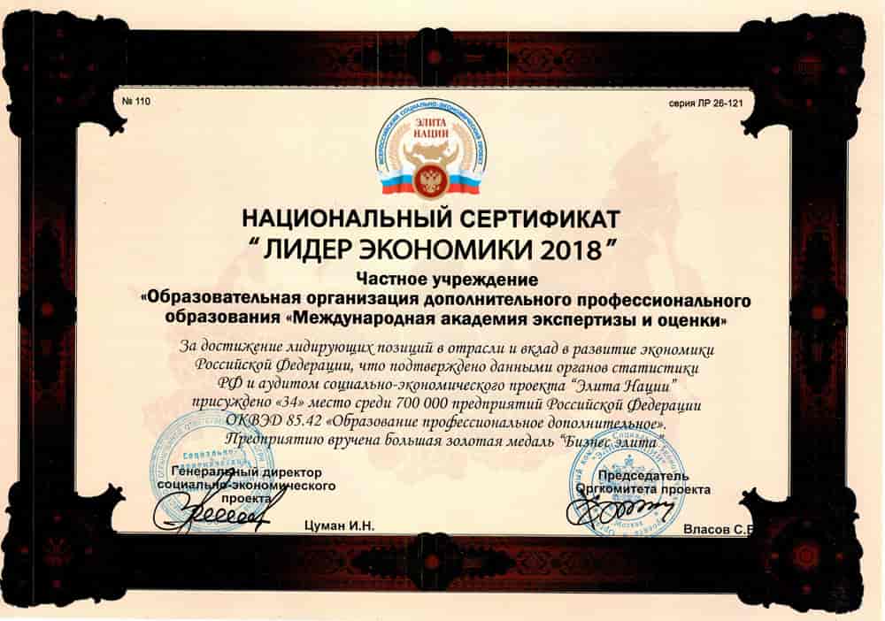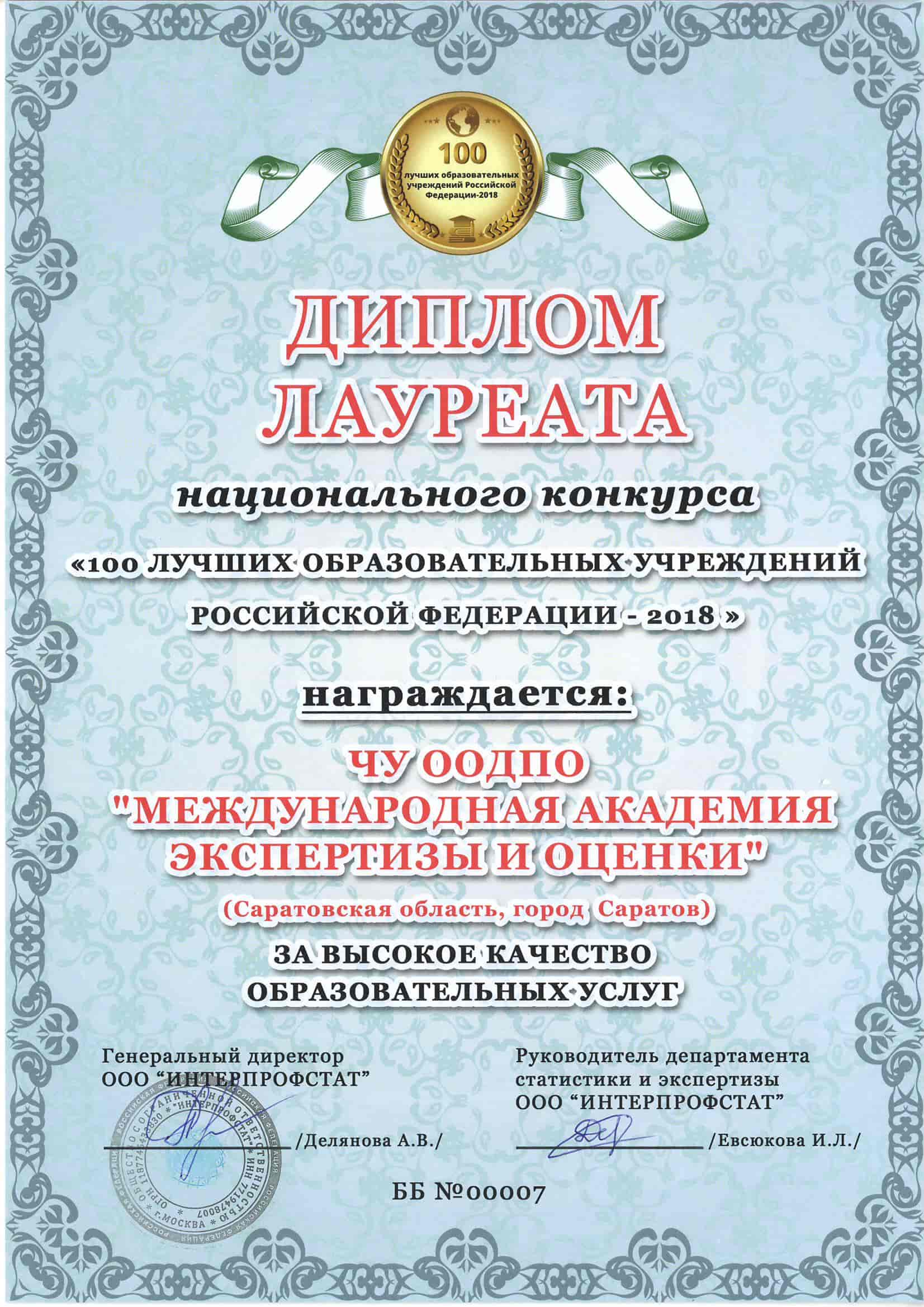 • ТОП-100 лучших образовательных учреждений России по данным Интерпрофстата в 2018 г.;